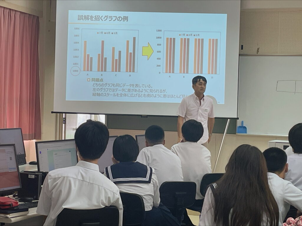 八重山地域のような離島地域においては、データ活用や情報技術に関する学修機会が限られる場合もあります。今回の出前授業を通じて、生徒がデータサイエンスに対する理解を深めるとともに、「情報Ⅰ」で学ぶ内容を地域や社会の課題と結び付けて捉える視点を養うことを目的として実施しました。