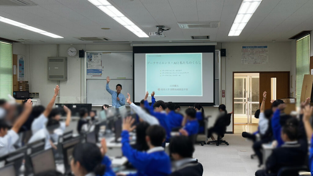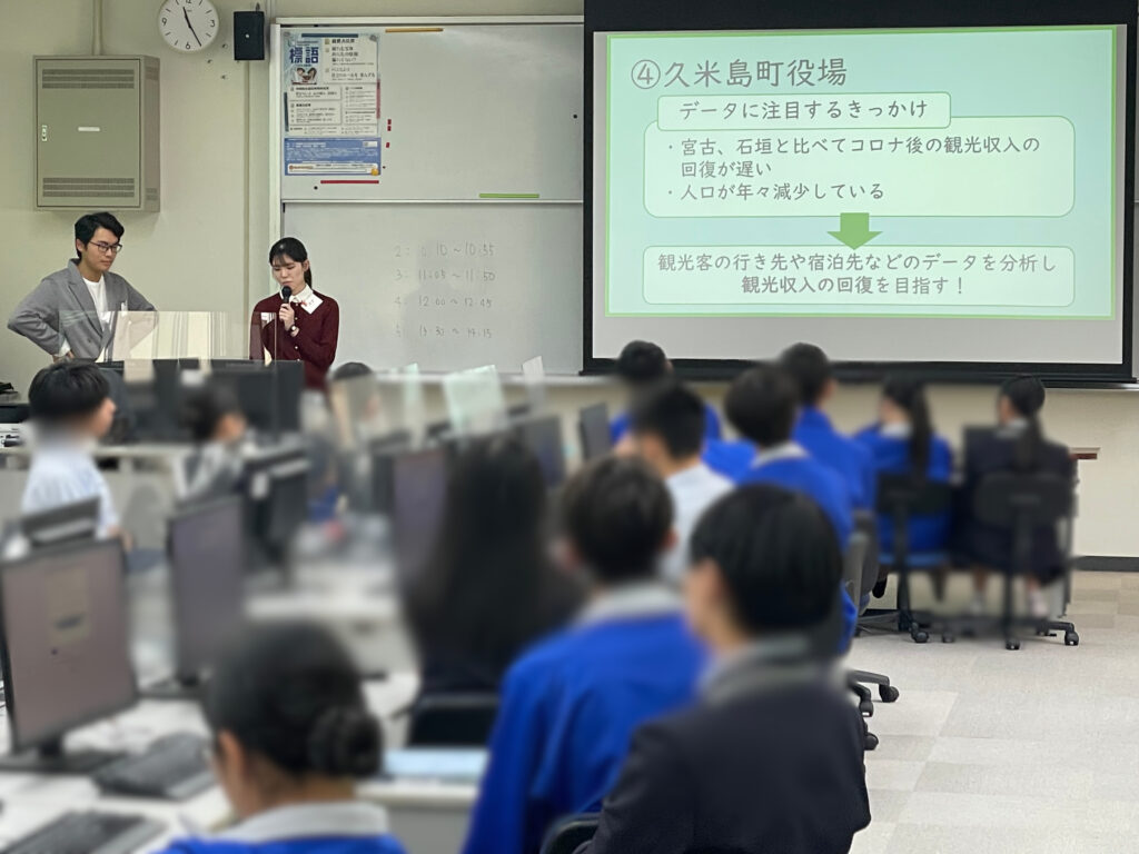 久米島高等学校では前年度にも出前授業を実施しており、今年度はその内容をさらに発展させ、久米島地域が抱える課題や地域産業を授業内容に取り入れた実践的な構成としました。授業にあたっては、本学教員に加え、国際地域創造学部に所属する現役の大学生2名が講師として参加し、生徒にとってより身近な視点からデータサイエンスの学びを伝える機会としました。