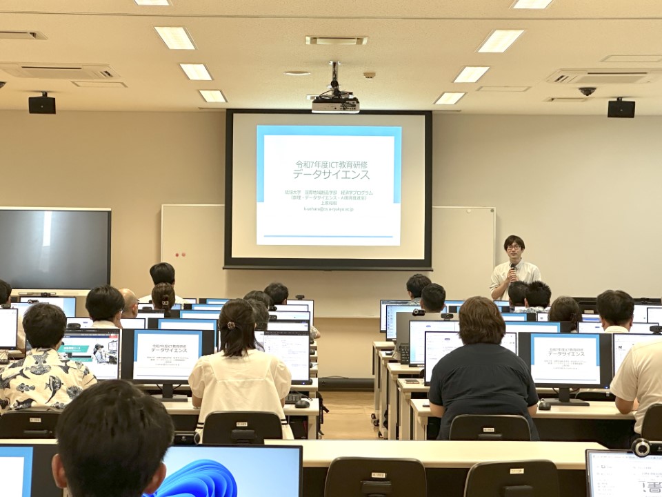 令和7年10月10日、沖縄県立総合教育センターが主催する「令和7年度ICT教育研修 教科『情報』実践講座B」において、高校におけるデータサイエンスの事例や教材例に関する講演を実施しました。本研修は、県立高等学校において「情報Ⅰ」を設置している課程の教科「情報」担当教諭48名を対象に実施されたものです。
