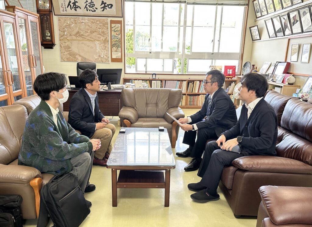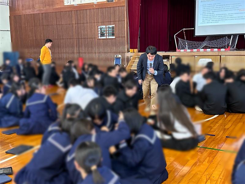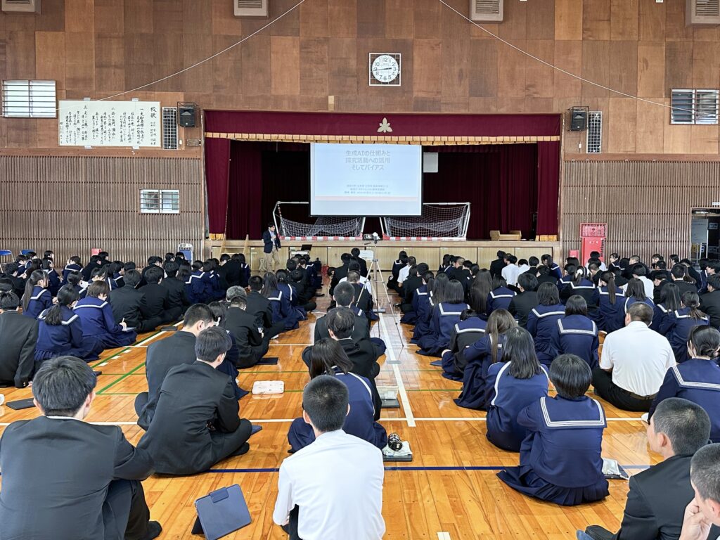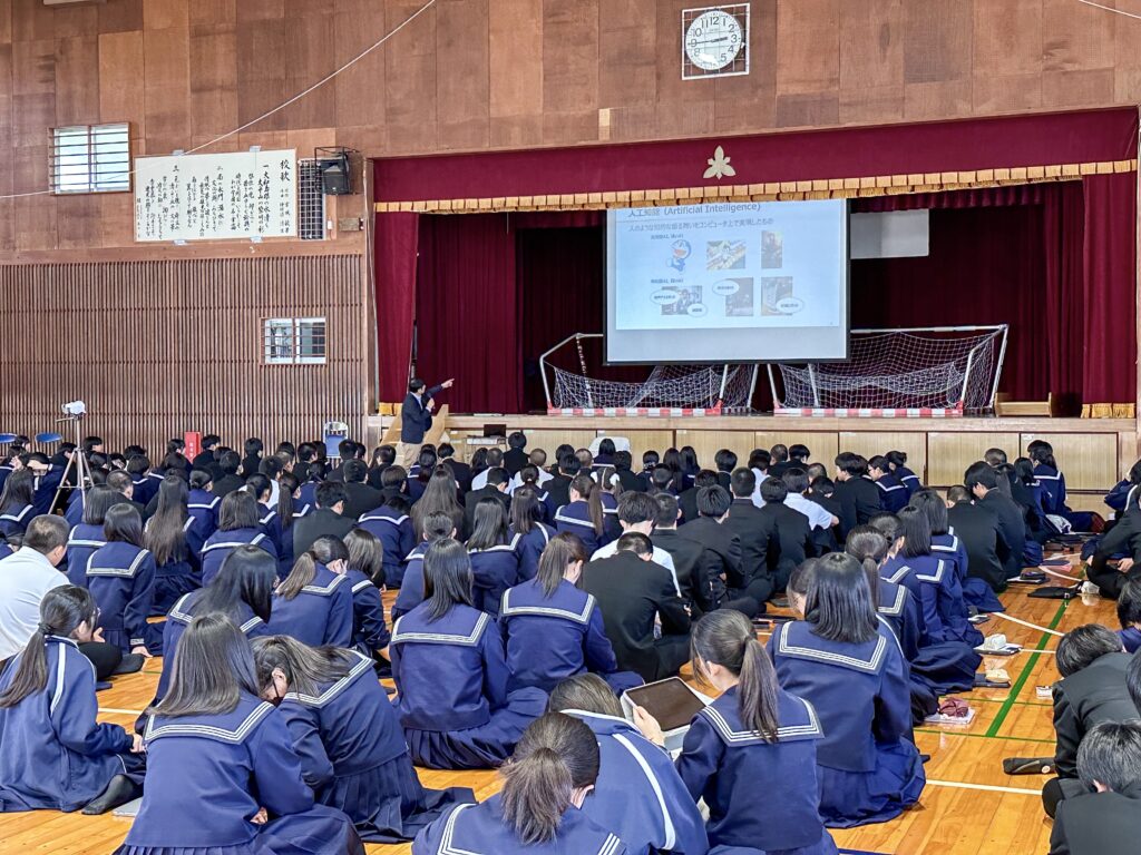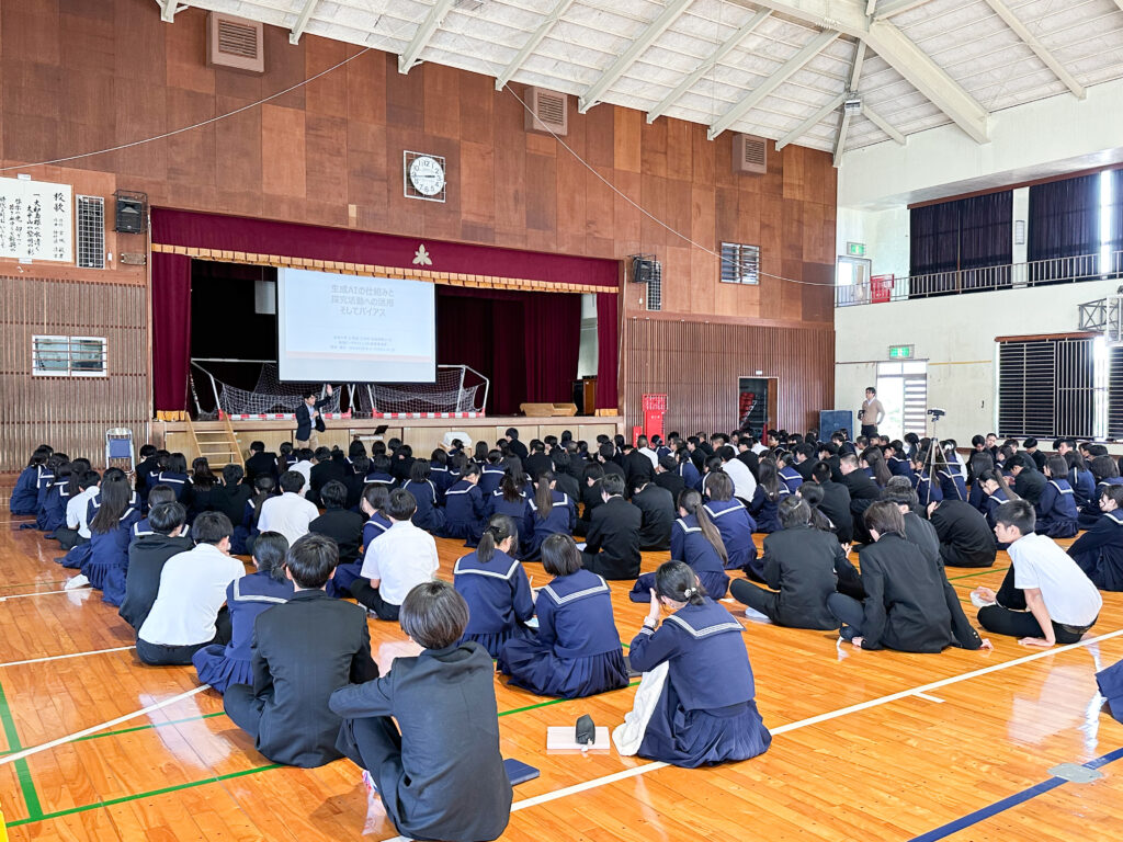 出前授業に先立ち、校長先生へのご挨拶の機会をいただきました。その中では、「近年の学生は生成AIを使用すること自体には抵抗がない一方で、自分自身で考える前に生成AIを使ってしまう傾向があり、思考することの意義を十分に理解できているのだろうか」といった懸念が示されました。あわせて、大学生においても生成AIは実際に使用されているのか、また、使用している場合にその成果物が生成AIによるものかを見分けることは可能なのか、といった点についてもご質問がありました。
