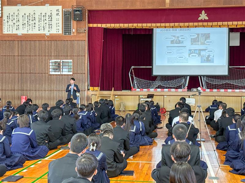 令和8年1月14日(水)、宮古高等学校において、1学年約220名を対象とした出前授業を実施しました。本授業は、体育館に生徒を集めた一斉授業形式で実施しており、本校では前年度にも出前授業を行っていますが、今年度は開催形式を見直し、クラス単位での実施から学年全体を対象とした形式へと変更しています。